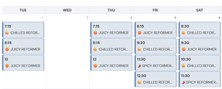 The classes are 50 mins classes and will be combination of Chilled (our beginners class), Juicy (our intermediate class) and Spicy (our jumpboard class). Don’t worry if you don’t have jumpboard training - this is something we can include in our training days.